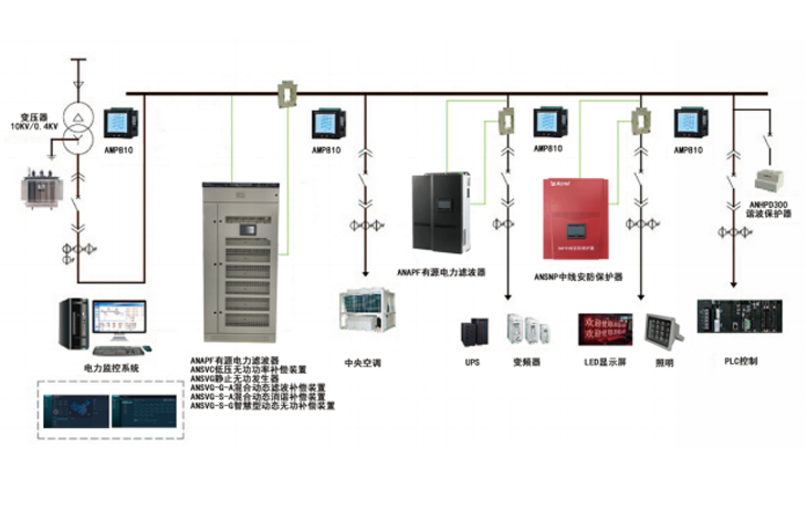 电能质量分析与治理系统由低压侧电能治理产品组成,主要产品有ANAPF有源电力滤波器、ANSVG静止无功发生器、ANSNP中线安防保护器、ANHPD谐波保护器、ANSVC低压无功功率补偿装置、ANSVG-G-A混合动态滤波补偿装置、ANSVG-S-A混合动态消谐补偿装置、ANSVG-S-G智慧型动态无功补偿装置等。